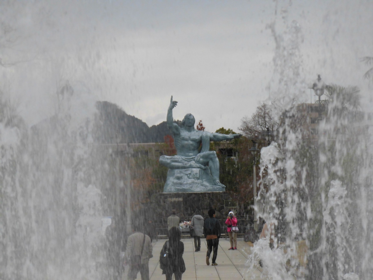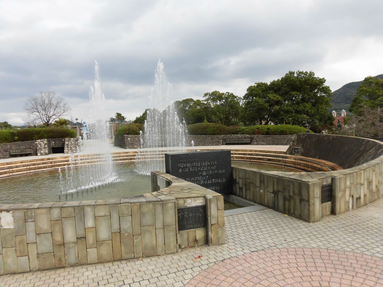 直径18メートルの円形の泉で、平和の鳩と鶴の羽根を象徴した噴水が舞い、正面には、被爆し、水を求めてさまよった少女の手記「のどが乾いてたまりませんでした 水にはあぶらのようなものが一面に浮いていました どうしても水が欲しくて とうとうあぶらの浮いたまま飲みました」が刻まれています。
