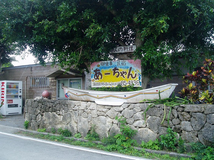 黒島の港から仲本海岸の方に向かって真っ直ぐ2km程先にある民宿。食堂も併設しており、朝夕はそこで食事をいただく。オーナーがおしゃべり好きで、食事が終わるとテラス席に場所を移して同宿の人たちとのゆんたくが自然と始まる楽しい宿だ