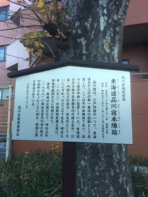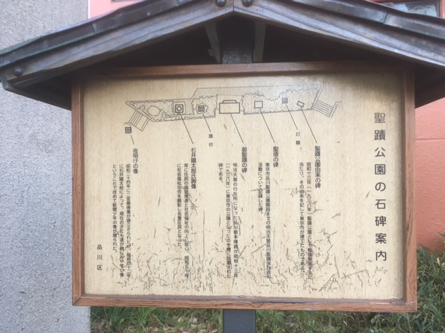 ここ聖蹟公園は品川宿本陣のあった場所として知られていますが、当然のことながら、その名のとおり明治天皇の行在所でもあった場所です。休みの日など、ここは様々な催し物に使われていて、ただの広場と化した感もありますが、ここには五つの石碑があり、よく読むとこの公園の来歴などが理解できます。「聖蹟公園由来の碑」「聖徳の碑」「御聖蹟の碑」「石井鐡太郎胸像」「夜明けの像」です。来園の際には、ぜひその全てに目を通してみてください。