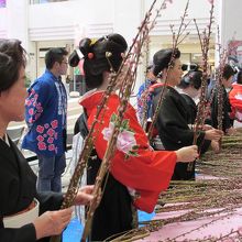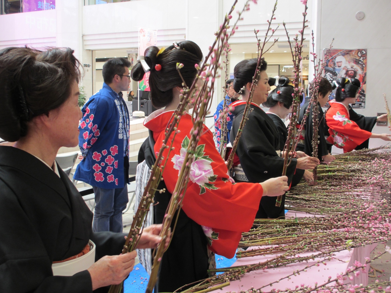 毎年サンシャインシティで開催される花のイベントの一つで、噴水広場で行われます。山梨県笛吹市で開かれる桃源郷祭りのPRを兼ねて行われます。当日は三味線の演奏でイベントを盛り上げるとともに、ワインの試飲と販売の他、桃の花枝がプレゼントされます。春の到来を告げるイベントだけに、多くの人が列を作り花枝をもらっていました。