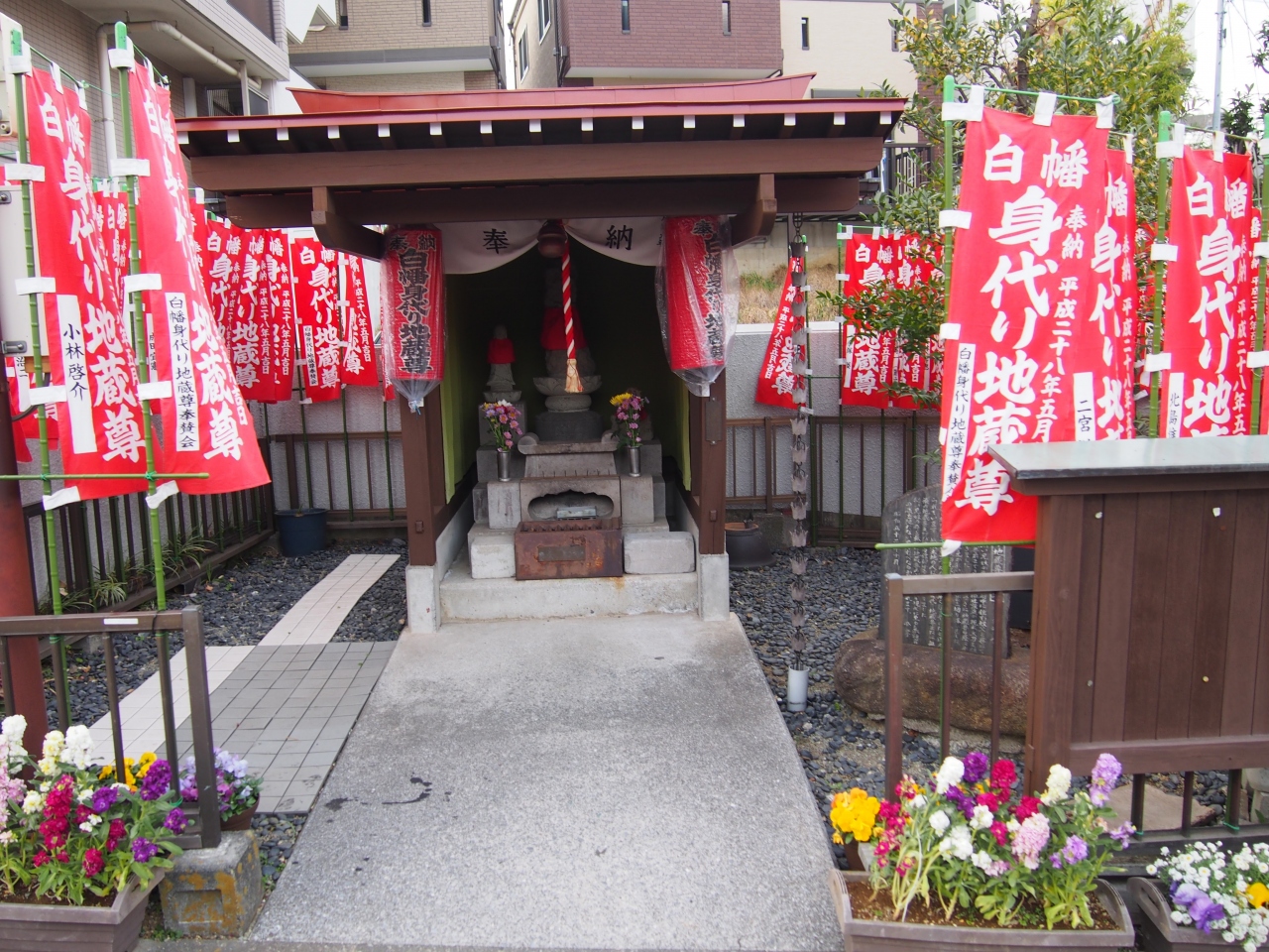 東急東横線の白楽駅の改札を出て右折。数分歩いた左側にひっそりとありました。尾張の国から叔父を訪ねてやってきた幼い兄妹が辻斬り強盗に合い、切られそうになったが刀はこの地蔵の首を切り、兄妹は助かったという由来のようです。