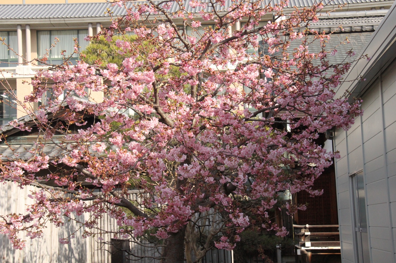 鐘の近くに仮設事務所がありますが、その横にはまさに満開を迎えようとしている河津桜の木がありました。