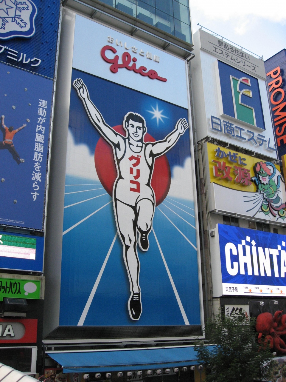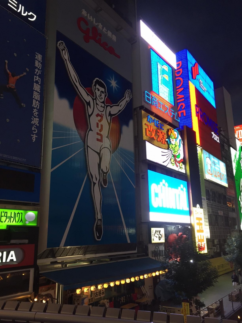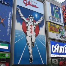 有名なグリコのネオン、テレビなので見るのは青く光っていましたが、私が行った時は明かりがついていませんでしたが、皆さん看板と同じポーズで写真を撮っていました。