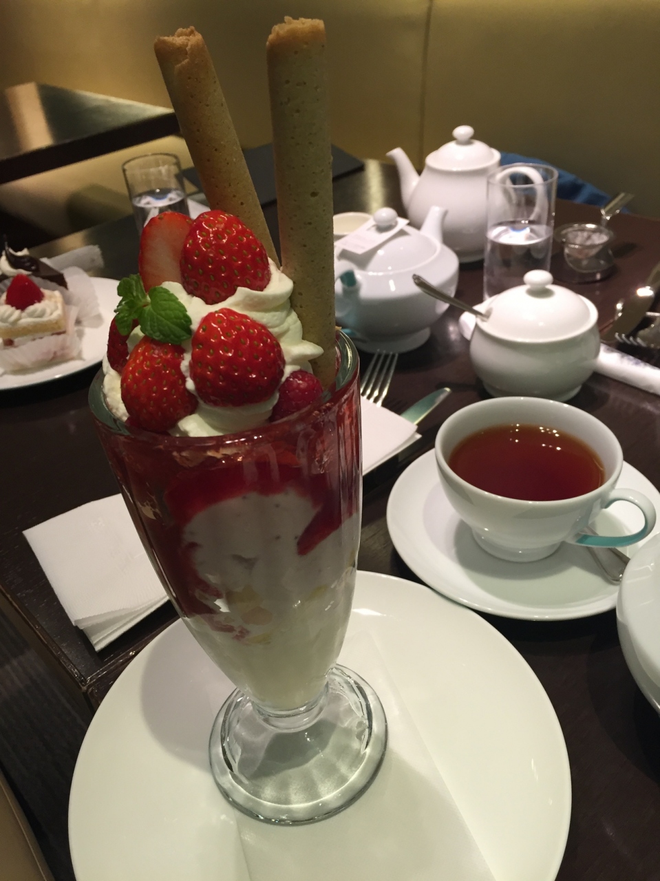 いつもお腹が空いて入ればアフターヌーンティが食べたいと思いつつ、ケーキ止まり。今回はニッカボッカ グローリーというパフェを食べました。アイスクリームやパインなどが入って無駄にコーンフレークなどが入ってないので とても美味しく頂けました。紅茶はロイヤルミルクティなどはなく、本来の紅茶にミルクを入れるスタイルのみです。
