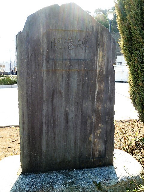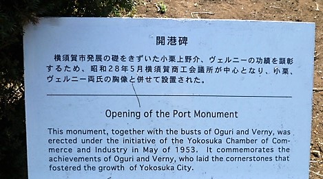 ヴェルニー公園の真ん中にある銅像`勘定奉行・小栗上野介忠順とフランス人技術者・ヴェルニー`が目に入りますが、直ぐ傍に[開港碑]がありました。案内板があるのを見てこの石碑に気付きました(^o-!) 石碑と2つの銅像がセットの横須賀の礎ですネ!