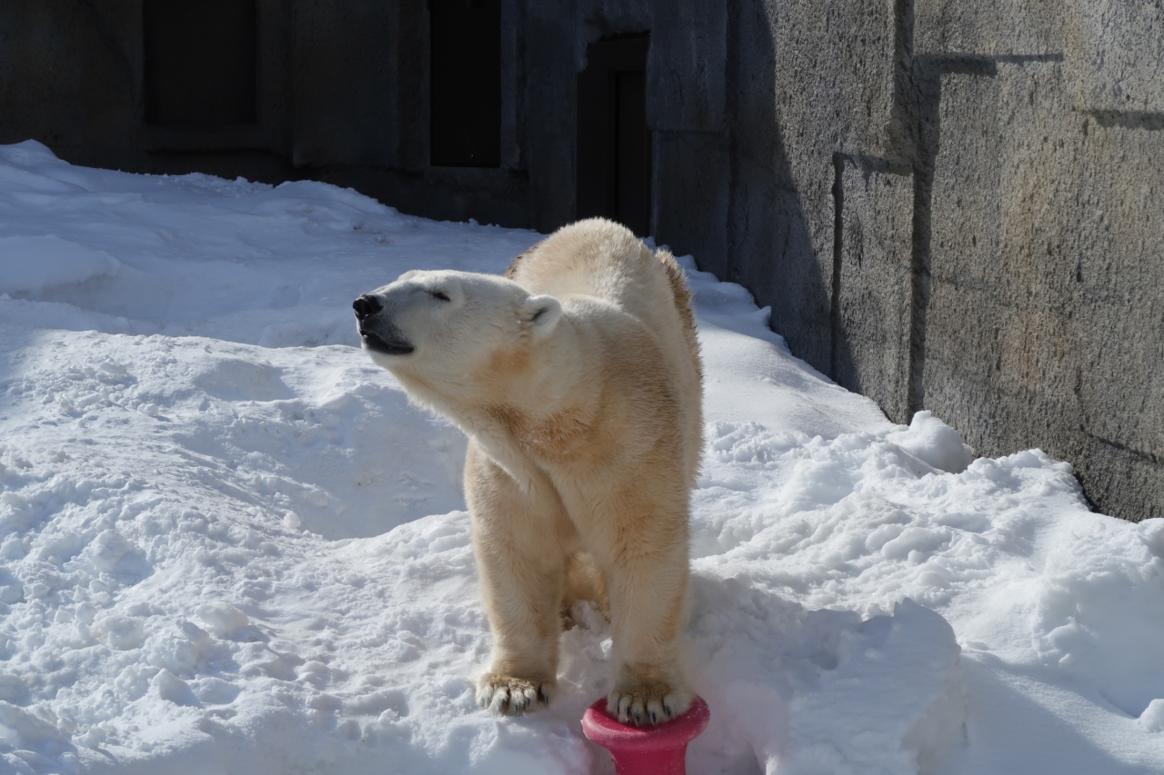2月の寒い中、多くの動物たちが建物内にいますが、さすがホッキョクグマは冬でも外で元気に遊んでいます。