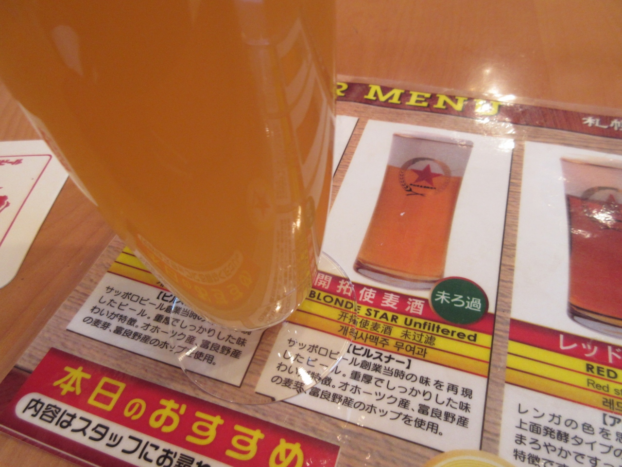 札幌開拓使麦酒醸造所でつくられたビールを一杯250円で試飲するというお店。開拓使麦酒(未ろ過)ピルスナータイプを頂きました。メニュー説明文には「重厚でしっかりした味」とありましたが、それほどの印象はありませんでした。