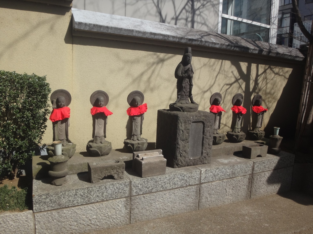 場所が明治通り沿いのにぎやかな場所なのに、ここだけ静かに落ち着いているので空気がちがって面白いです。手前はほとんど駐車場だけの広いスペースですが、入口の脇にやたらとたくさんの地蔵が並んでいるのが目をひきます。