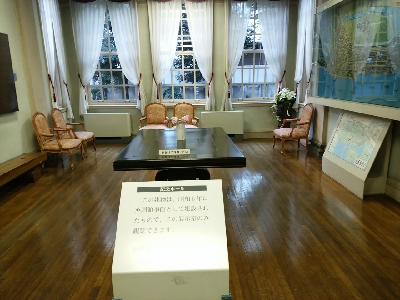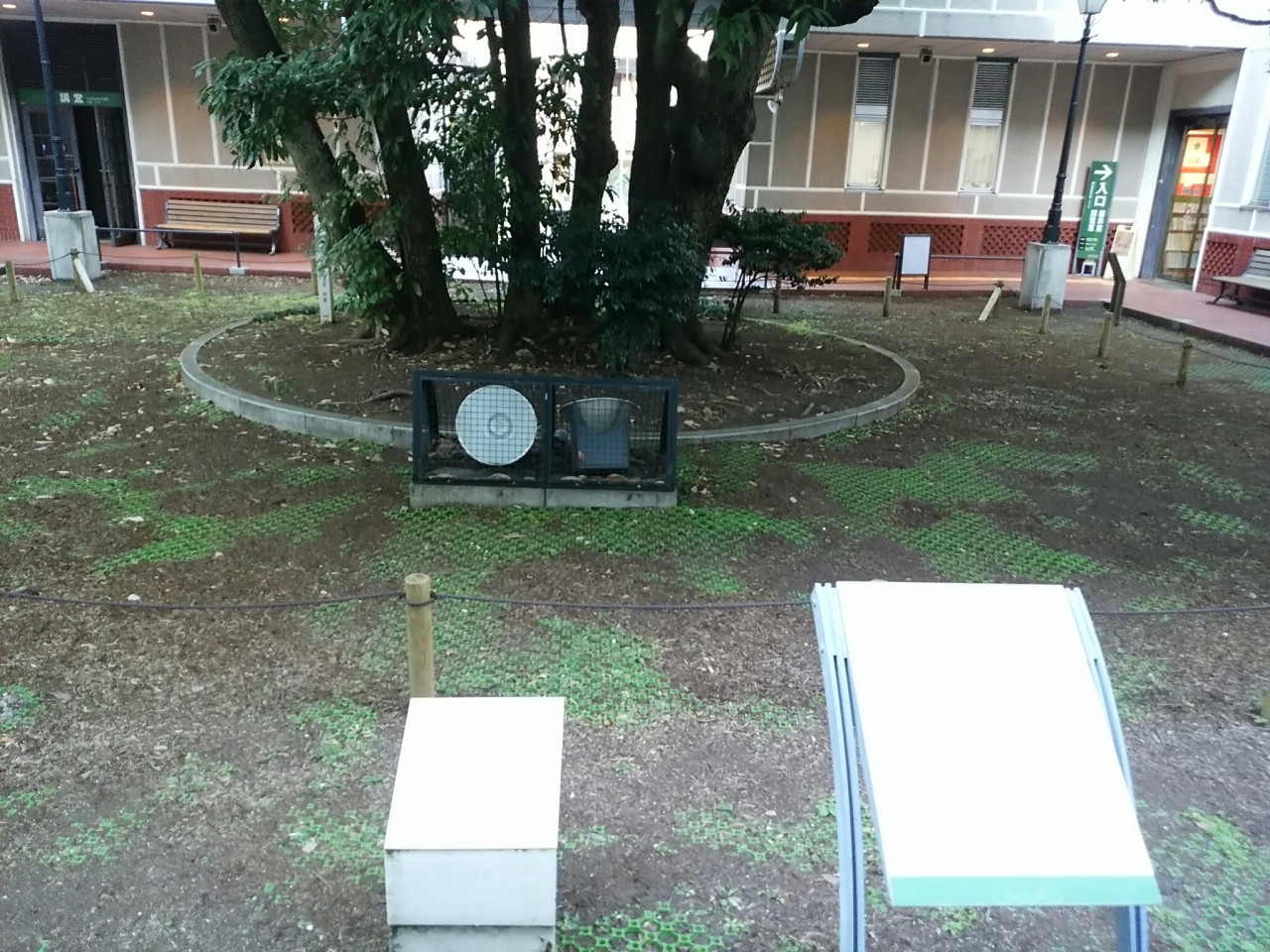 横浜開港資料館の中庭にあるタブノキで、入館前の見どころのひとつです。開港の前から枝葉を広げていた大木で、歴史的な日米和親条約が締結された米艦隊の随行画家ハイネの「ペリー横浜上陸図」に応接場とともに描き込まれていました。歴史を見守ってきた大木は今もなお大事に保存されていました。