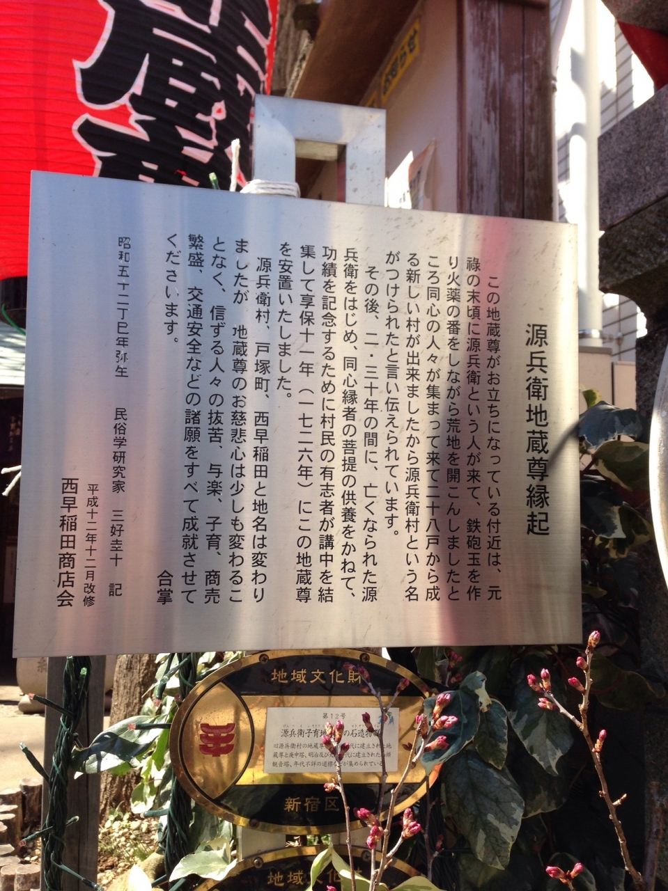 本当の名前は源兵衛地蔵、昔荒地だったこの辺りを開こんした源兵衛さんが亡くなったおりに供養をかねて 安置されたそうです。当時この地は源兵衛村という地名でもあったそう。今は西早稲田となってこの辺りの地図や昔の街の写真も飾られていました。