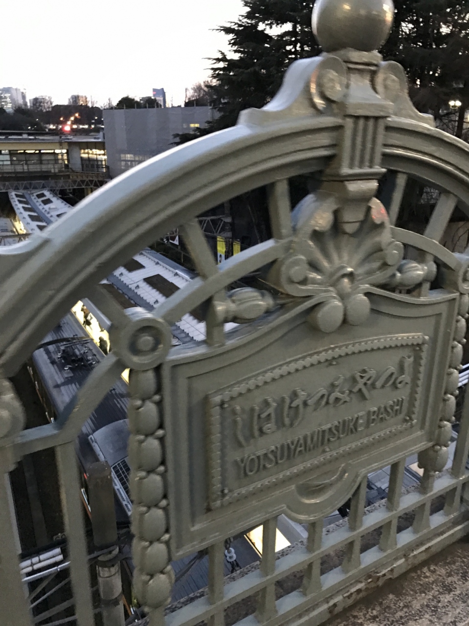 麹町6丁目から新宿区に通じる、新宿通りにある橋です。大正2年、1913年9月10日に初めて架設した橋で長さ38.6メートル、幅22メートルで、橋の装飾にフランス式手法を採用するなど豪華な橋でした。現在の橋は平成3年に完成したものであります。