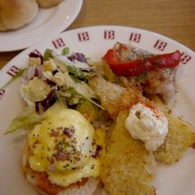 1枚の皿に、国産野菜のサラダ、白身魚のカツレツ、エッグベネディクト、グリルチキンが盛られている。