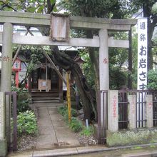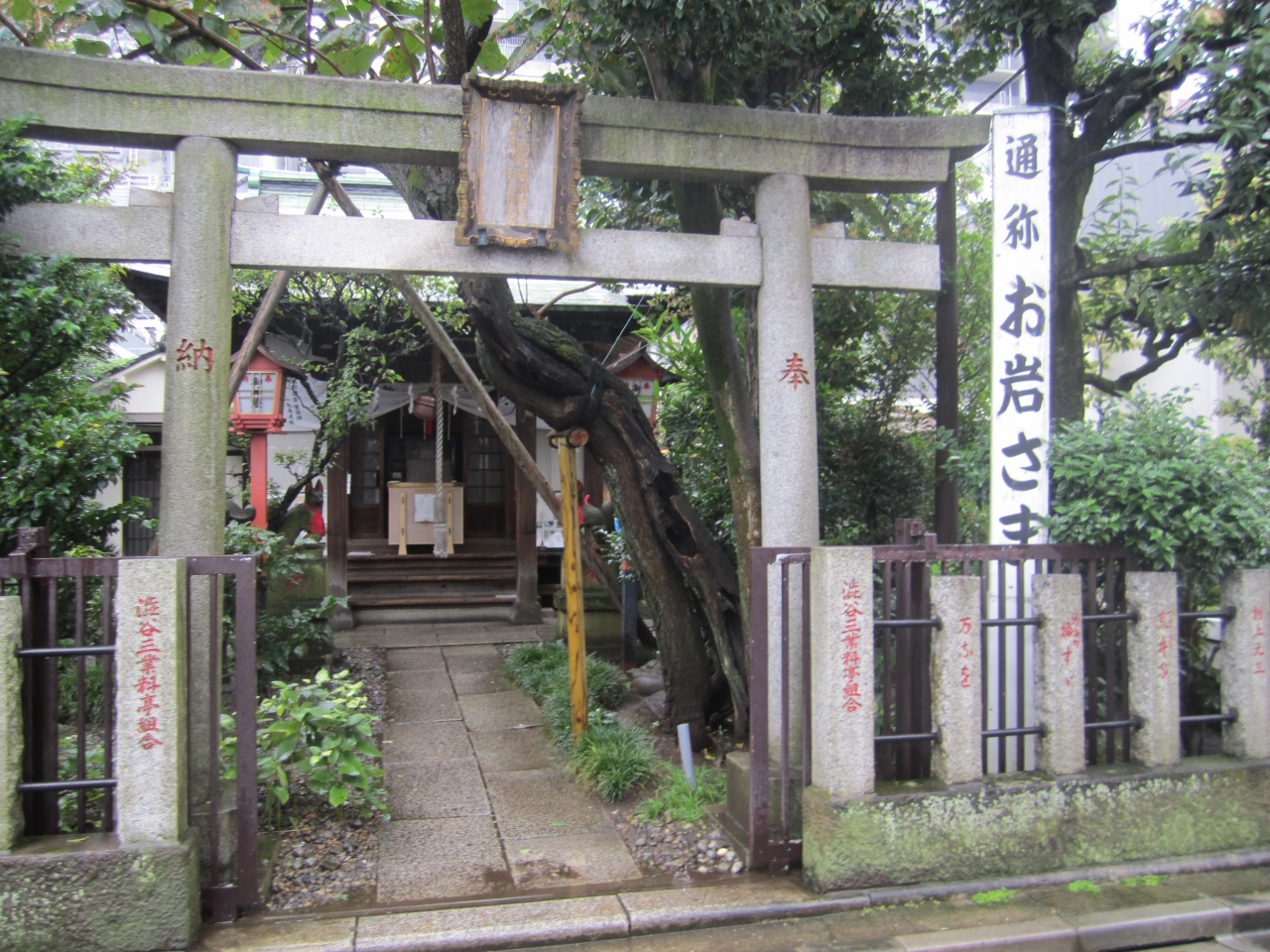 四谷於岩稲荷田宮神社は、東京都新宿区左門町、四ツ谷三丁目駅から信濃町駅の間の住宅街にありました。「お岩さま」と書かれた白い棒状の看板が目立っていました。