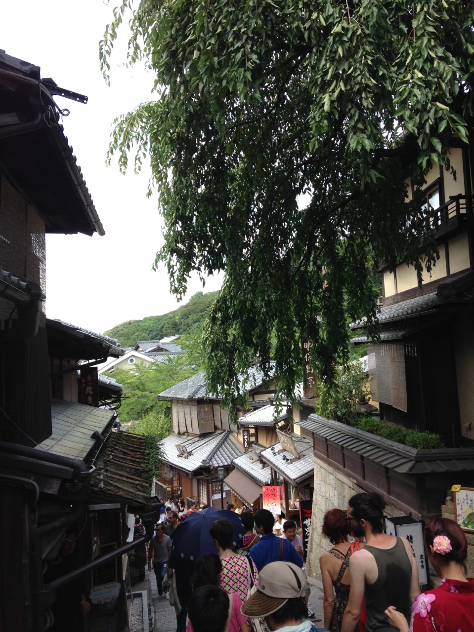 瓦屋根が重なり合い、いかにも京都らしい風景がとても良いです。人が多くとても賑やかでカフェや土産物屋が並んでいました。急な石段の坂道なので下るときは特に気をつけた方がいいです。ここで転ぶと3年以内に死ぬと言い伝えもあるとか‥。