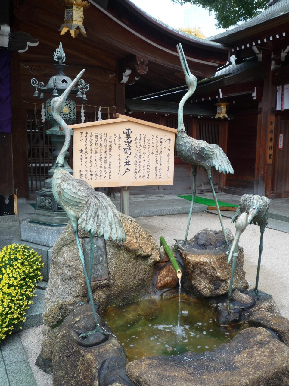 本殿近くにある三羽の鶴の像が囲む井戸です。