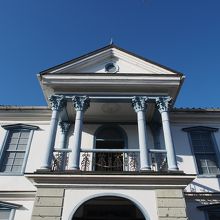 明治16年に建造された洋風建築です。まだ洋館についての知識がないまま、当時の大工の棟梁が見よう見まねで作った建物なので、ブルーのすてきな彫刻のある柱はなんと木製。そのほかも漆喰でそれっぽく見せたりと当時の棟梁の苦労や工夫があちこちに見られてなんとも面白い建物です。