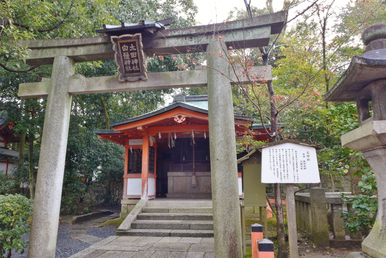 こちらは八坂神社の境内にある末社のひとつで、西楼門を入って本殿の方へ向かう通路の左に建っていました。猿田彦神と天鈿女命が祀られているそうですが、こちらは夫婦ということになっています。