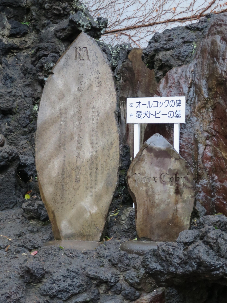 熱海七湯の一つ大湯間欠泉苑地の間欠泉の右手を良く見ると墓碑が並んで立っています。これがオールコックの愛犬トビーの墓です。間欠泉を見に来る人は多いですが、殆どこの碑を見てる人は居ません。歴史好きの人は知っているかもしれませんが、オールコックは初代駐日英国公使。そのオールコックの愛犬トビーがこの間欠泉で火傷を負いなくなったことを悼んだ碑とトビーの碑が立てられたとのこと。