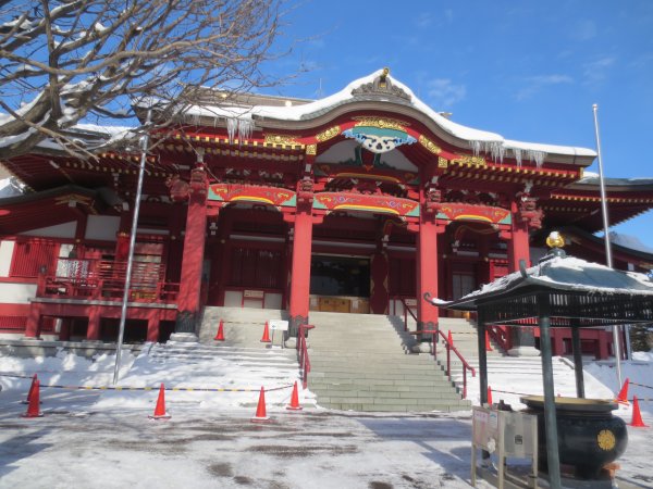 『成田山』の文字のあるのぼりが雪に隠れて下の方が見えず、確認すると、札幌別院とありました。何回か訪れたことのある成田山にゆかりのある寺院を旅行先で見つけられたことになにか偶然以上のものを感じられました。大香炉の手前には時節柄、翌月の節分会の掲示がありました。ちっょと入りづらいと思っていると『ご自由にご参拝ください』の立て看板もあり、気遣いを感じられ良かったです。