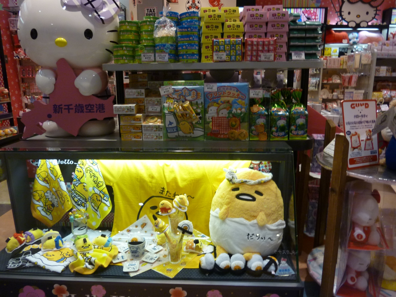 北海道に来てもキティーが買えるんです。酉年だからのグッズ、北海道ならではのグッズ、新千歳空港ならではのグッズまで買えちゃいます。かわいいスーツケースから、もちろんお菓子までも幅広い品揃え。変わり種は、ぐでだまも売ってますよ。