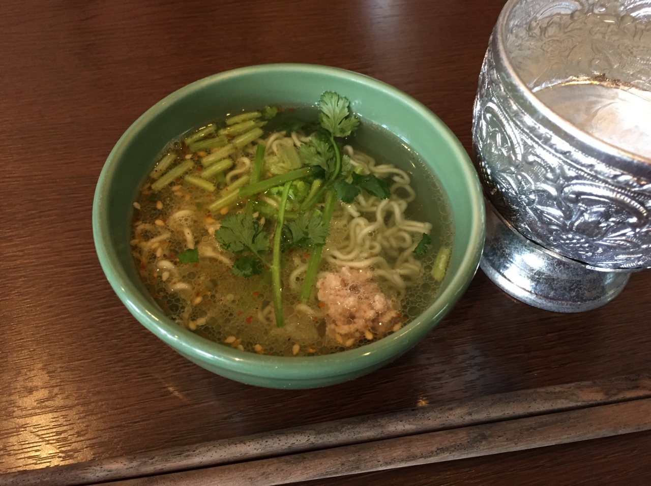 今回だけか、最近の傾向かわかりませんが、ランチについてくるミニ麺が変わって、緑の細麺になりました。