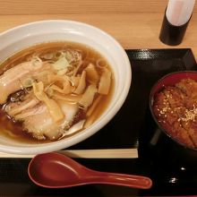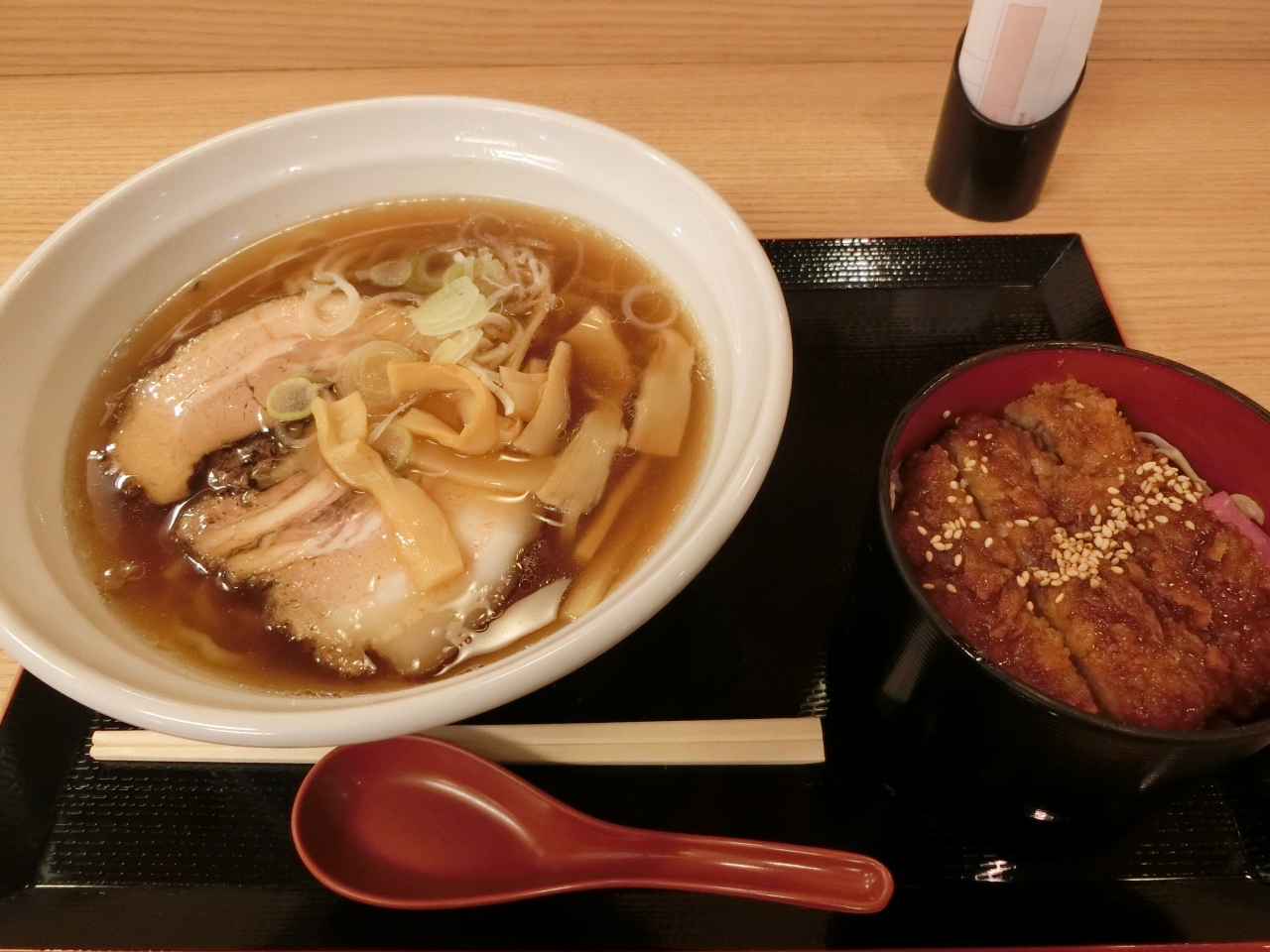 鶴ヶ城を拝見する前に寄ってみました。喜多方ラーメンとミニソースカツ丼のセット!