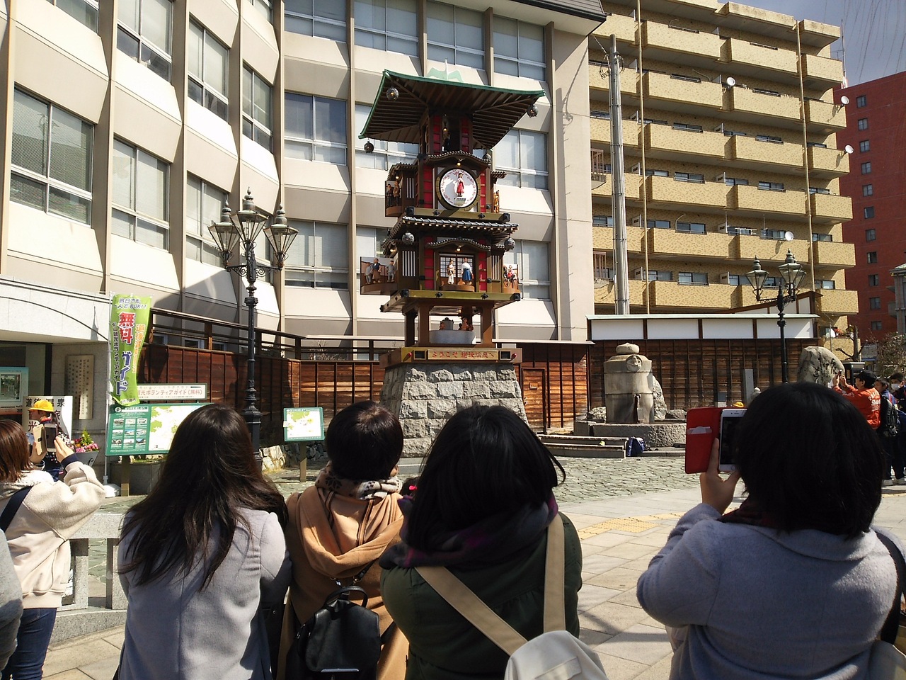 道後温泉駅前、ハイカラ通りの入口右側にドーンとあります。たまたま到着したときに動き出したのでラッキー。1時間に1回動くようです。横に開いたりするのは他のどのカラクリ時計も一緒ですが、ここのは上にも伸びていきます。そんな伸びるのかってくらい。