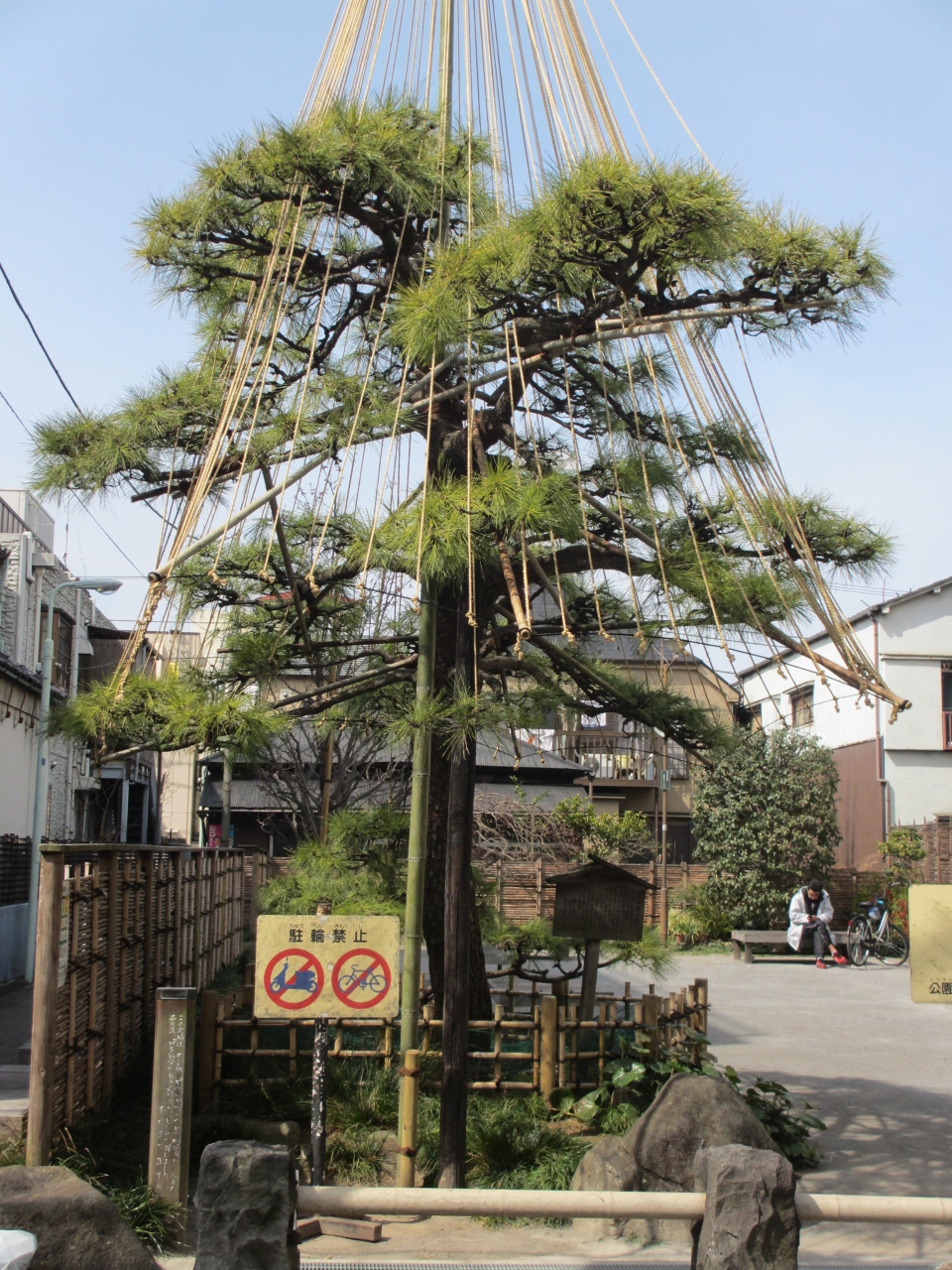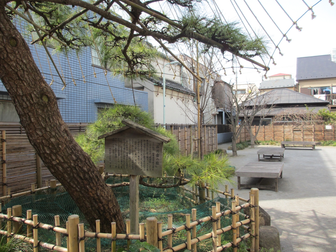 京急・北品川駅から旧東海道を進み、目黒川を渡って100mほど行ったところにある広場です。ベンチが設置され、地元の人がおしゃべりをしたり、観光客が休んだりしています。広場の入口には、樹齢80年を超える黒松が植えられています。品川宿では、大阪まで57次あった宿場から街道松を寄贈してもらい、東海道沿いに植える活動を行っていて、ここに植えられている黒松は、その第一号として浜松から贈られたものです。見事な枝ぶりが目を引きます。旧東海道沿いには何本もの松が点在しています。一本一本その由来を確認しながら歩くのも楽しい散策です。