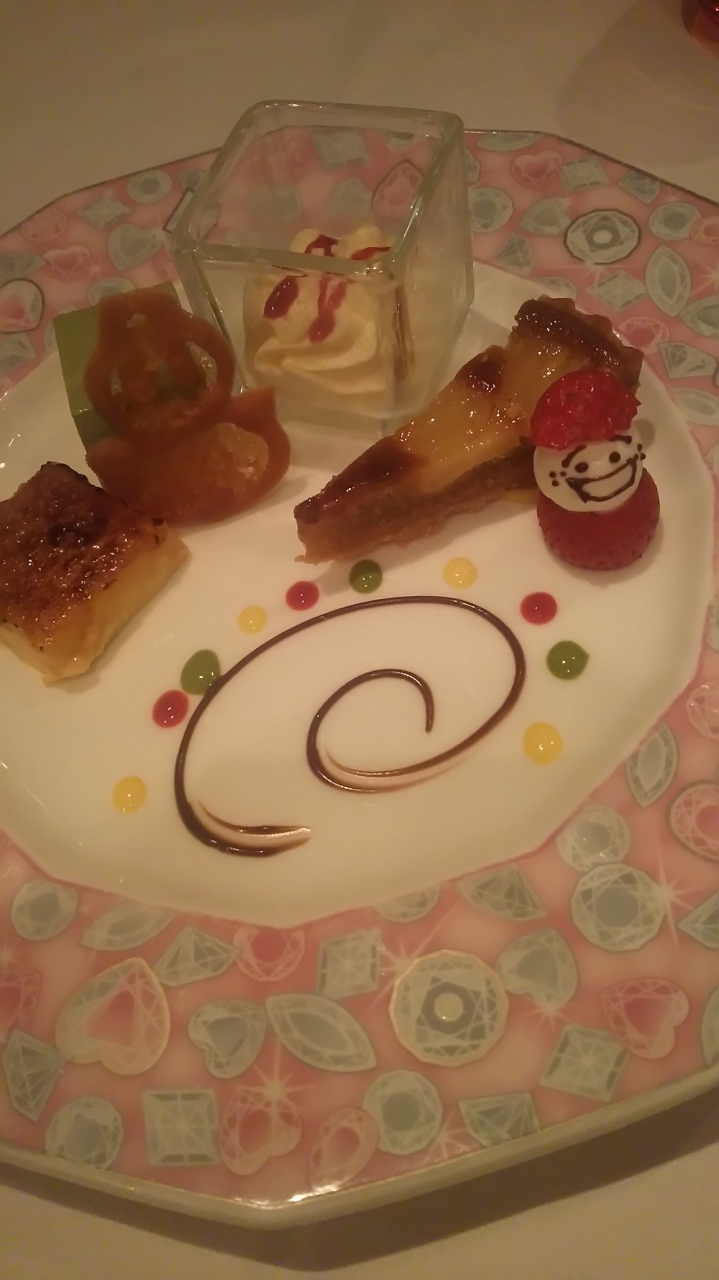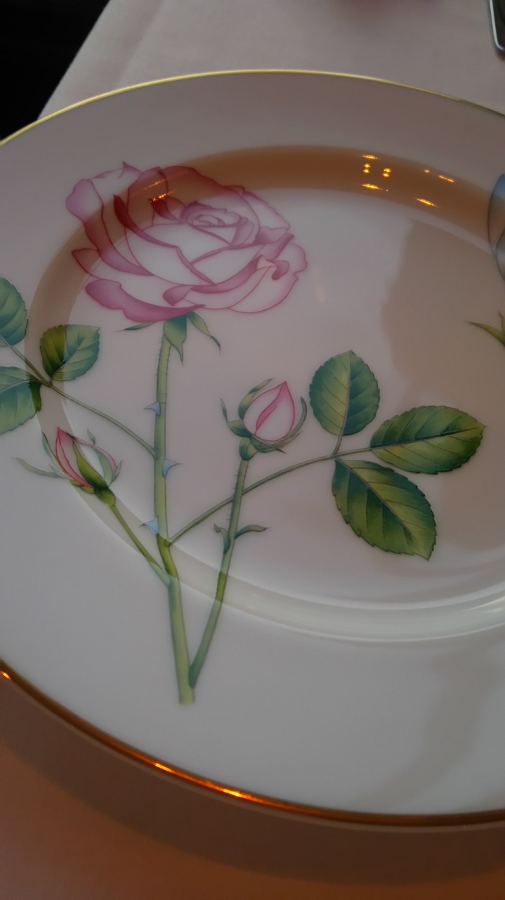 ディナータイムにコース料理をいただきました。レストラン内は広くはありませんが皇居が見渡せて、お花もたくさん飾られています。印象的なのはプレート一枚一枚デザインが違うことです。また、プレートとプレートの間に花びらが散りばめられていたり女子がうれしくなるポイントがいっぱいです。かなりボリュームもあるので男性でもかなり満足できると思います。