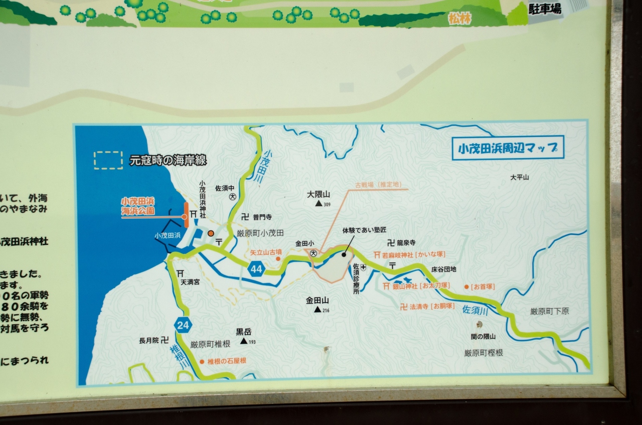 海岸近くに小茂田浜神社があり、戦死者の霊を祀っている他、元寇についての案内板もありわかり易いです。
