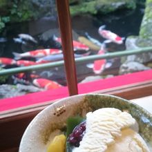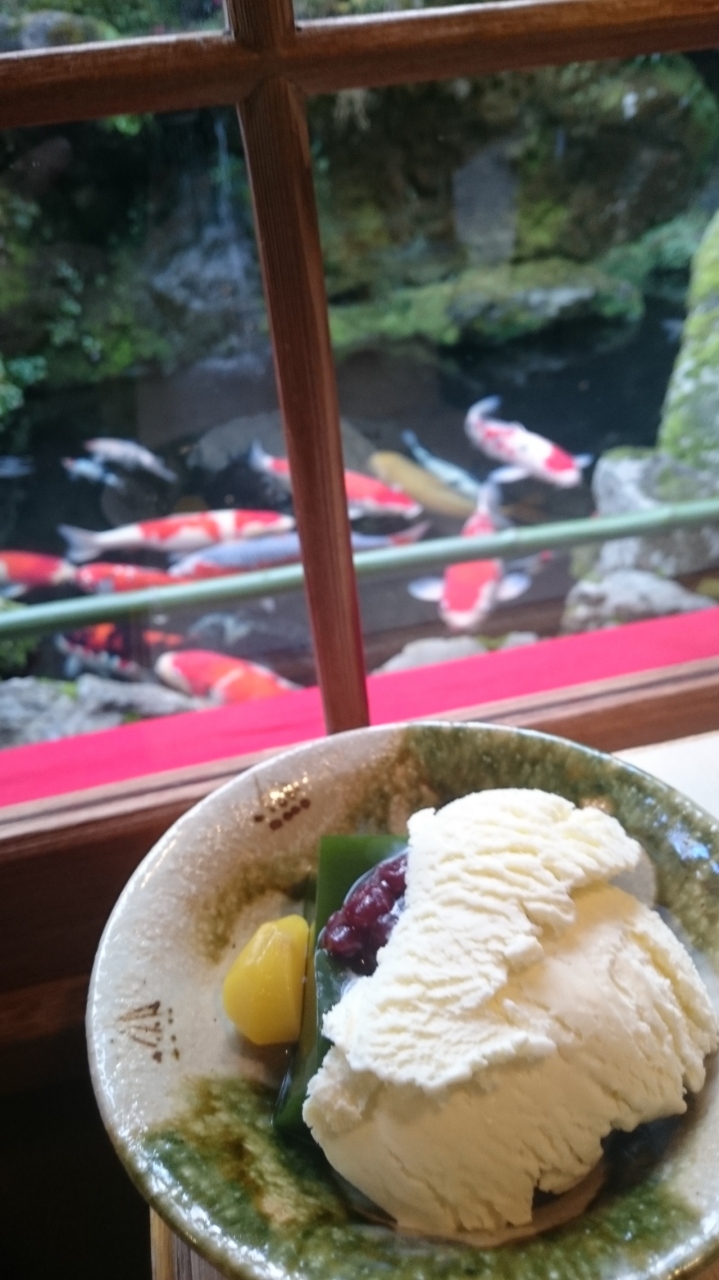 並んでいないのを見計らって覗いて見ると、錦鯉の池のわきにはお客様が何組みか待っていた。でも、この待ち時間がある方が錦鯉の池を間近で見ることができます。席があくと呼んでくれる。当然とろけるようなわらび餅と抹茶です。他にもたくさん食べたいものがあるけれどやっぱりわらび餅、食べたい。