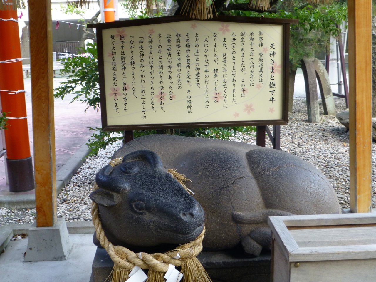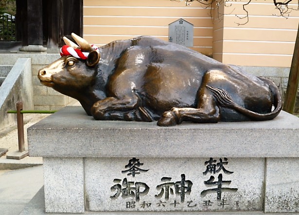 `菅原道真公歌碑`と並んでのこの[御神牛]です。流石[太宰府天満宮]ですね、(参拝後)`御神牛`が数多くあるはビックリ(*_*) (各地の天満宮には必ず一頭ですが`神牛`がおります。去年旅行先の仙台市の榴ヶ岡天満宮の`神牛`です) `天神様`は学問の神で菅原道真公ですが、`天神さん`はふせた牛で`なでなで`したのを覚えています。参拝者(外国人も,私も)は触って拝みました(^^)
