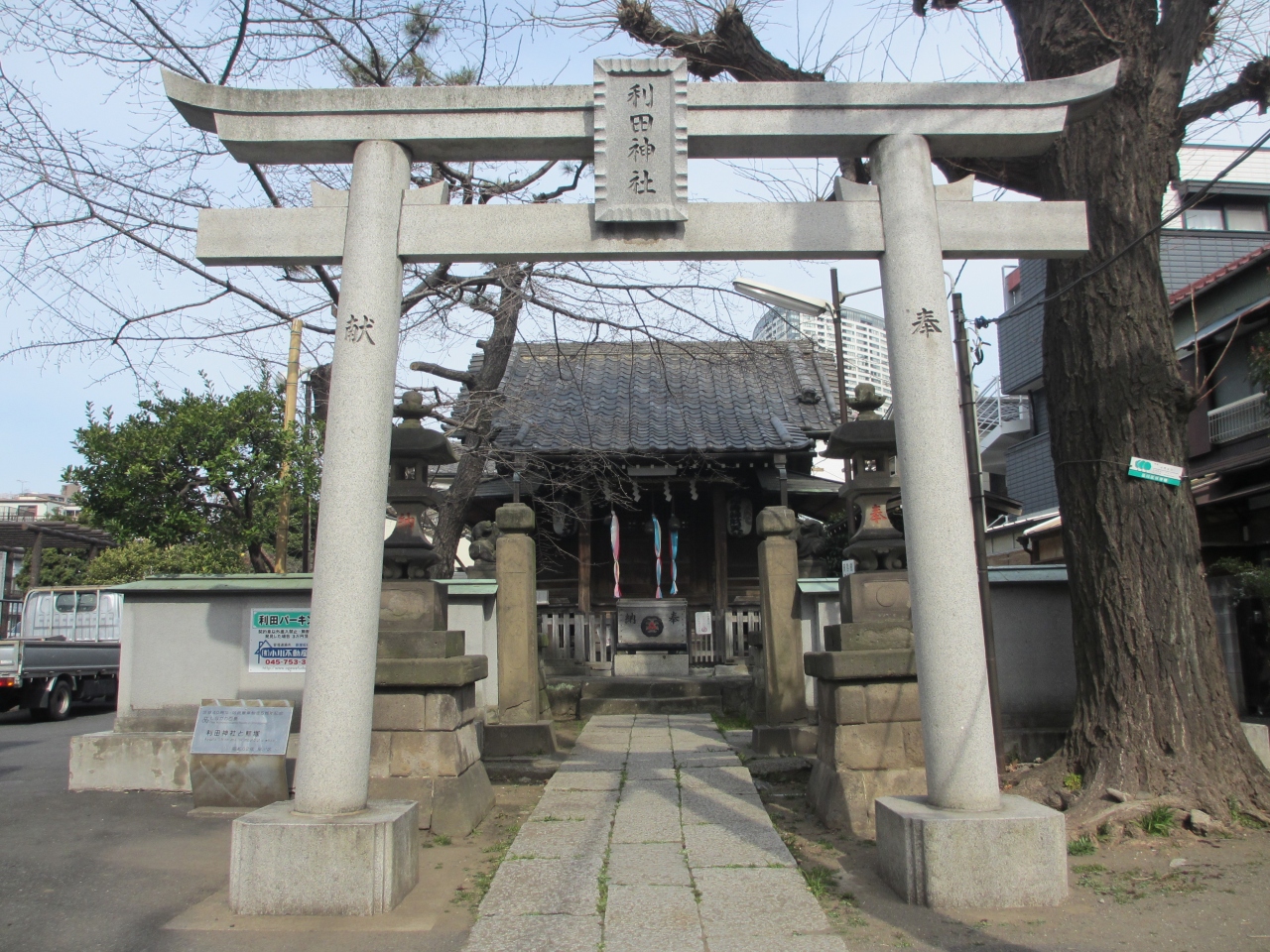 品川宿の南側にある狭い品川浦公園脇にある神社です。東海寺の沢庵和尚が弁財天を勧請したことが始まりとされています。社殿に福寿弁財天社と記されている提灯が下がっています。境内にはイチョウの大木がある他は普通の神社で、民家と公園に囲まれてひっそりとしています。社殿と公園の間にある鯨碑が特徴で、江戸時代ここに上がった鯨の骨が埋められています。鯨碑にちなんで公園には鯨のモニュメントがあり楽しいです。鯨碑を見に利田神社を訪れてはいかかでしょうか。