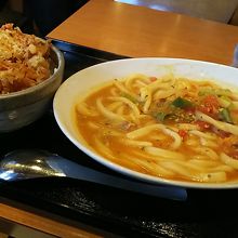 今回は普通のカレーうどんではなく、「トマトテイストカレーうどん」を注文。あわせて桜エビのかき揚げ丼も注文したので少々高くなりました。