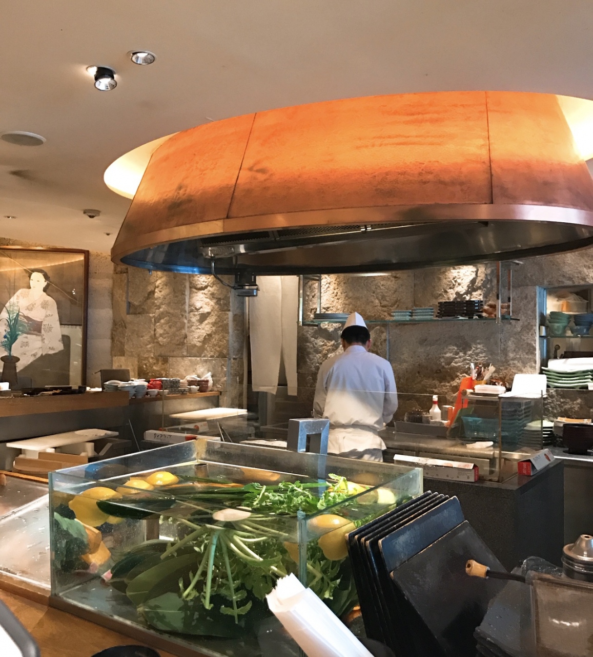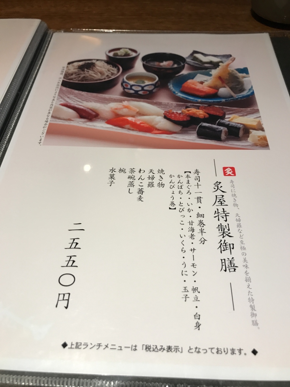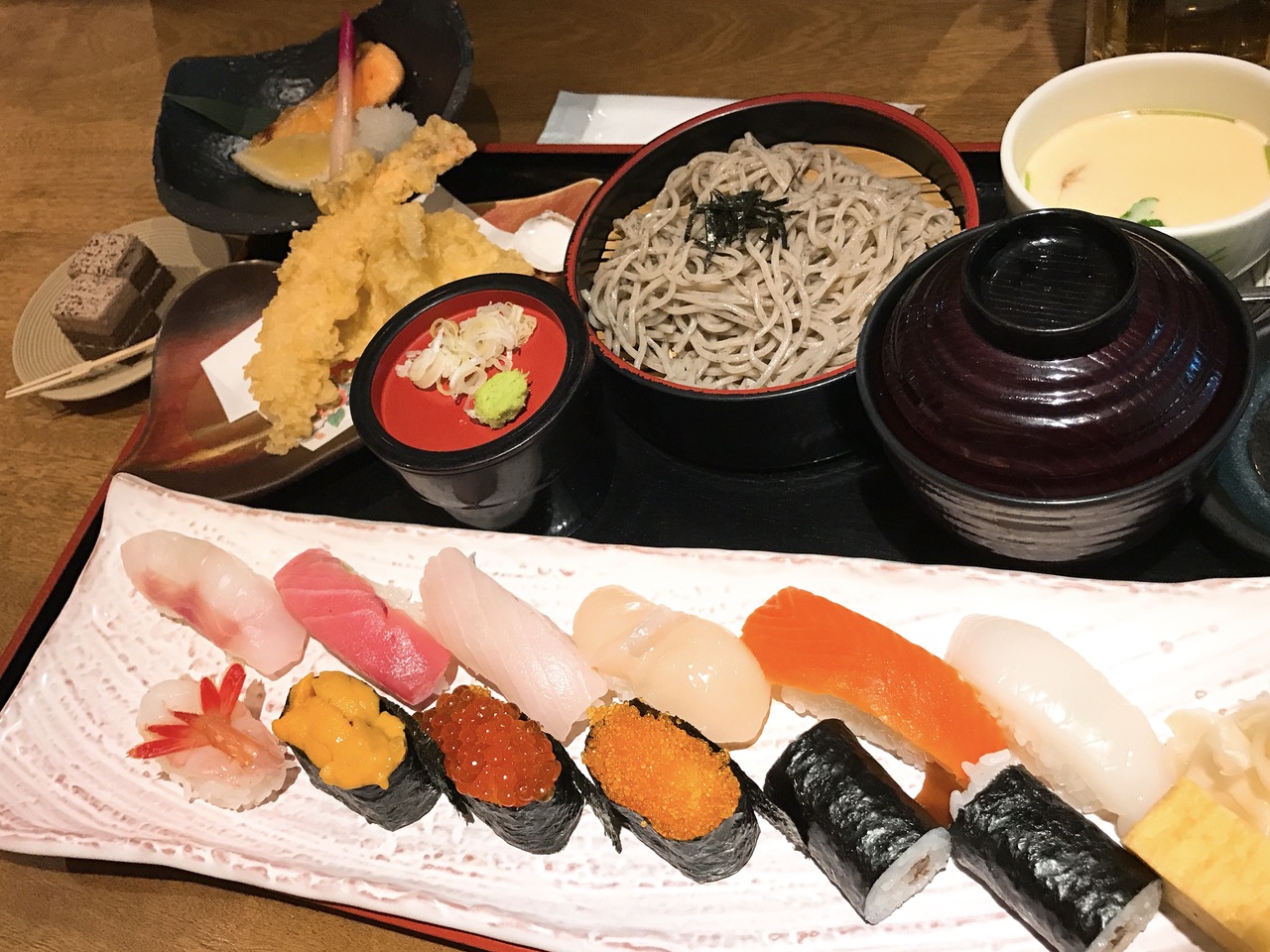 大通ビッセ4階にある景色の良い場所にあり、土曜日の午後1時に訪問したところ4組ほど待つ客いた。店の前ににあるフロアにソファがあり座って10分ほど待つと呼び出しありカウンターに案内された。カウンターからは寿司を握る職人がみえて楽しめた。椅子の配置間隔にゆとりがあって良い。ランチメニューには焼き魚やカツ丼、天丼もあった。