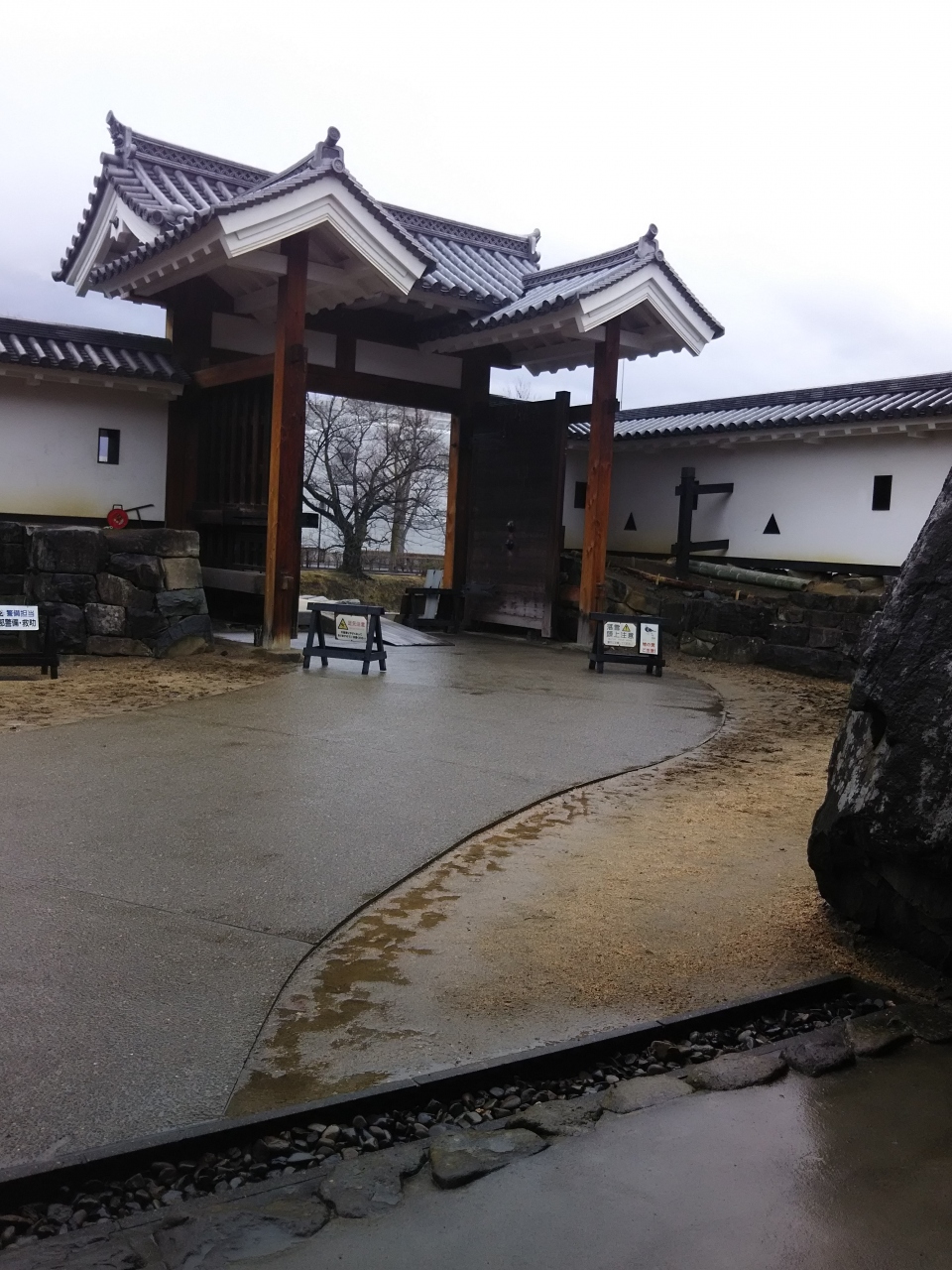 江戸時代は倉庫として使用されてたそうです。明治初年に破却されましたが、平成4年に石垣の復元を完了、その後に土台石の形に合わせて柱を削り、太鼓門が復元さたそうです。樹齢400年の檜、梁は140年の松が展示されてます。歴史を感じることができました。