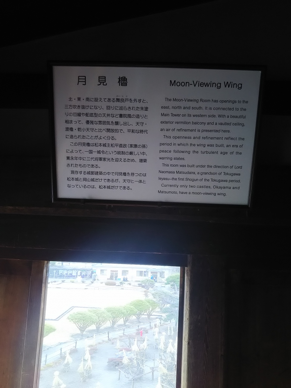 当時の三代将軍家光を迎えるために増築されたものだそうです。現存する城郭建築の中で、月見櫓をもつのは岡山城と松本城だけですが、天守と一体となった造りとなっているのは、松本城だけだそうで、東西南に開放的な作りが印象的でした。