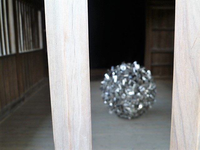 御本殿を参拝した後に案内所を通り越して[浮殿]に寄りました。私一人でした(皆さんは遂そこにいるのに?!) 砂利の中に建っているので`浮く`は想像ですが、木造平屋で屋根瓦は綺麗な曲線で水に映ると`一対の浮殿`では! 扉から中を覗くと(..)、銀色のまん丸の物が置かれていました。