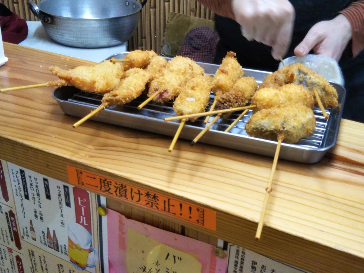 外宮参りをして夕方近く、外も寒くてサクッと食べて明日の内宮参りに備えて早めにホテルに戻りたい、そんなとき駅前にあった串揚げ屋さん。早い時間ということもあって一番乗り。子供は抱っこして片手で食べれるのが串揚げのいいところ。伊勢の食材のアッコ貝は大きくて美味しかった。熱燗で体を温めました。