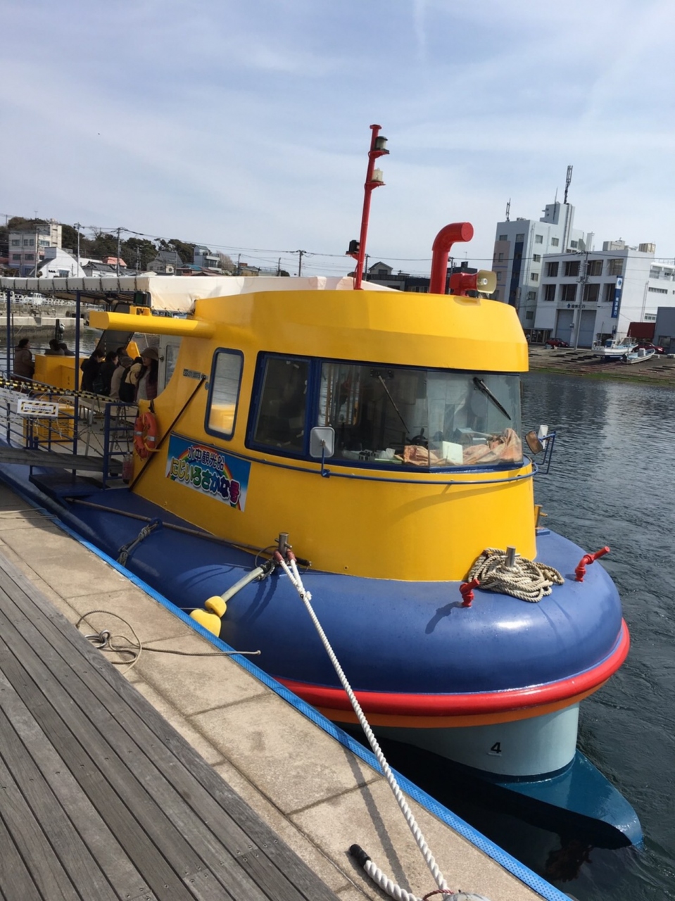 三崎港バス停を降りて右側にあるにじいろさかな号です。まぐろみさききっぷの特典で利用できるため休日は混みやすいです。出発後からポイント地点までの10分は船内にいても泡だらけで海底は見えないので、船の上にいてカモメに餌やりができます。エサは50円なので是非やってみてください。カモメが飛びながらキャッチしてくれるのが面白いです。