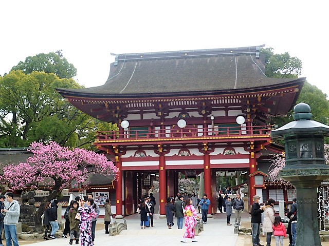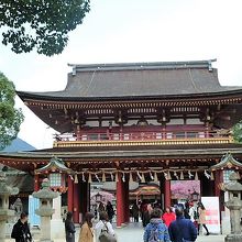 手水舎でお清めしていよいよ参拝します。これは立派な[楼門]ですね。皮葺の二重の屋根/赤な柱/白の漆喰壁/金の装飾/きちんとしたしめ縄/そして門の正面には御本殿が! くぐり抜けてもう一度[楼門]を見たら、あれっ?屋根が一重で白の漆喰壁に赤の留め具が! 考えると[楼門]はどの方向が正面になるのですかネ? もしかしたら御本殿からの方が、。