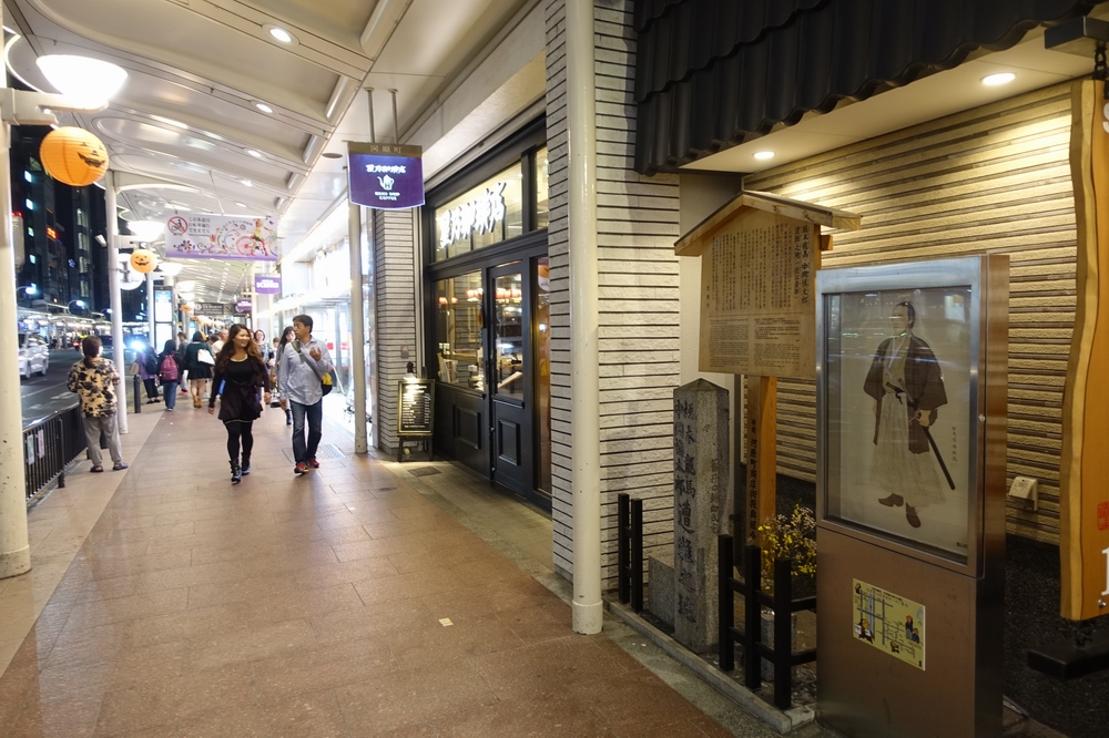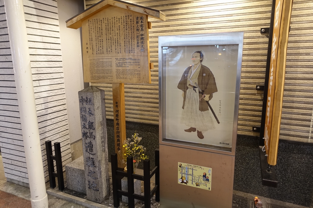 今となっては商店街の歩道沿いに石碑、説明板、龍馬の肖像画があるだけで、近江屋の面影はまったく残っていないのが残念。でも、坂本龍馬ファンにとっては非常に感慨深い場所だと思います。