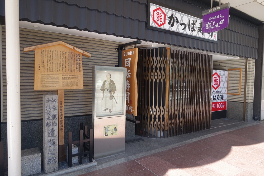 碑が建っている場所は現在かっぱ寿司になっています。ただ、近江屋が実際にあった場所は碑が建っている所の南にあたるそうです。ということは、隣の星乃珈琲店のあたりになるのでしょうか??龍馬が暗殺された場所でコーヒーを飲んでたのかと思うと驚きです。