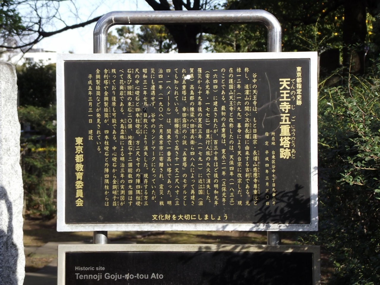 各地の寺院や神社などに五重塔や三重塔があるが、ここ天王寺にもかつては五重塔があった跡です。