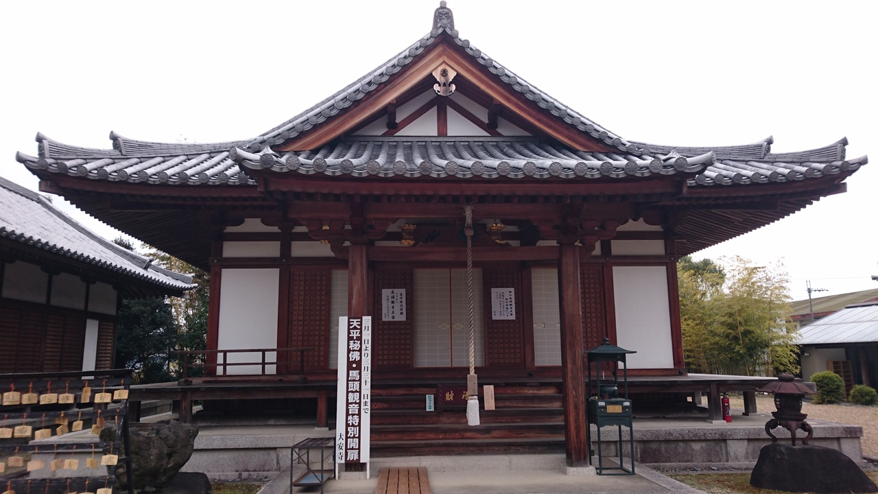 JR奈良駅西口にあるバスターミナルからバスで10分ほど。バス停は大安寺前だが、しばらく歩く。日本最古の寺院の一つで聖徳太子が建立、奈良時代にはかなり広い敷地だったのでバス停が大安寺前としていても不思議はない。現在は住宅地の中にあるお寺だが、天平時代からの仏像が残り本堂、嘶堂、宝物殿で拝観できます。3月末まで秘仏も公開されてました。癌封じで有名で多くの絵馬に切実な祈りが書かれていました。駐車場もあります。