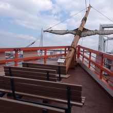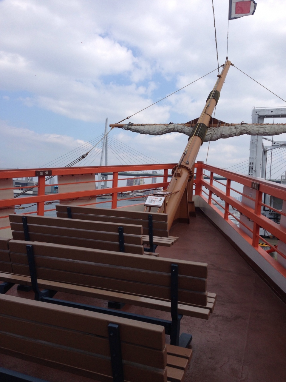 約45分大阪湾をぐるりと回ります。大きな帆船(帆は閉じられたままです)は ディズニーシーにでもありそうなロマンあふれるデザインです。1時間に1本ですが 定員数が多いので平日であればギリギリでも乗れそう。