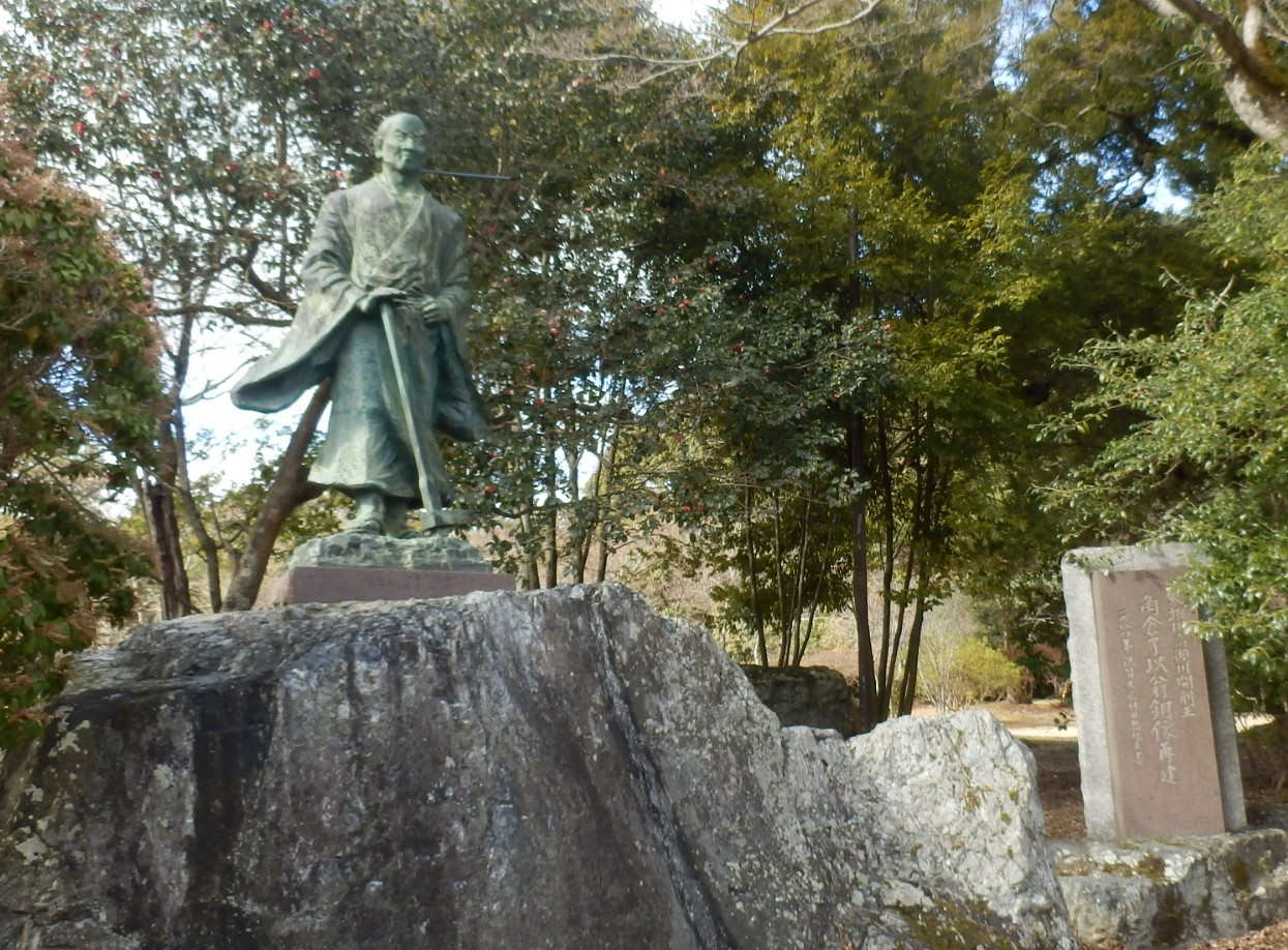 嵐山の渡月橋から上流(川上に向かって右岸)を500M程進むと右に登り坂があるここを登り切った場所に嵐山公園亀山地区内に建てられている、京都の豪商角倉了以により急流の大堰川(現在は保津川と呼ぶ)が開削された、この像は小高い丘にありここから翁が開鑿した大堰川を見下ろすことができる、この偉業をたたえるため翁の銅像が建てられた、像横の石碑に、大堰川開鑿王、角倉了以 と刻まれている