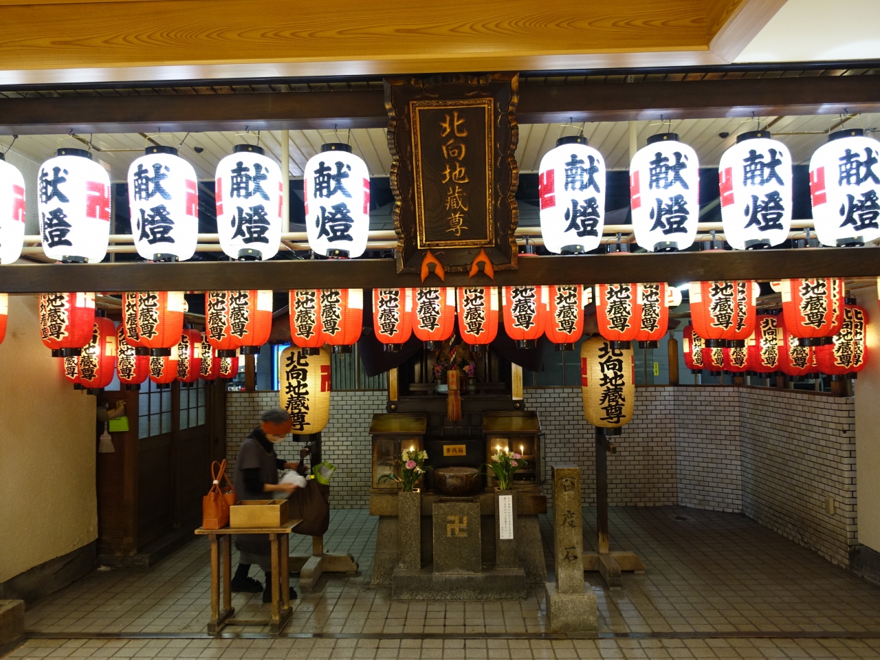 「阪急三番街」の雰囲気を楽しみながら飲食店街を歩いていると、突如「北向地蔵尊」が現れます。阪急三番街の飲食店街に「地蔵横丁」という名前が付いていたのは、この地蔵尊の事だとわかりました。地下街の雑踏近くという、意外な場所にあるだけに、とても印象深い光景でした。