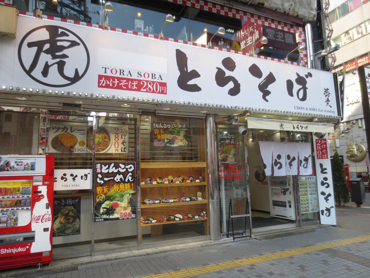 立ち食い系のそば屋です。場所は靖国通り沿い、ちょうど歌舞伎町の入口です。昔は確かゲームセンターがあったところと記憶していいます。メニューはそば、うどんが中心で温、冷ともあります。最安値のかけそばは280円。富士そばよりも安いです、でも他はさほど変わらない値段の印象。そばは普通の立ち食いそばの味。飲んだ後や、時短で食べる向きです。