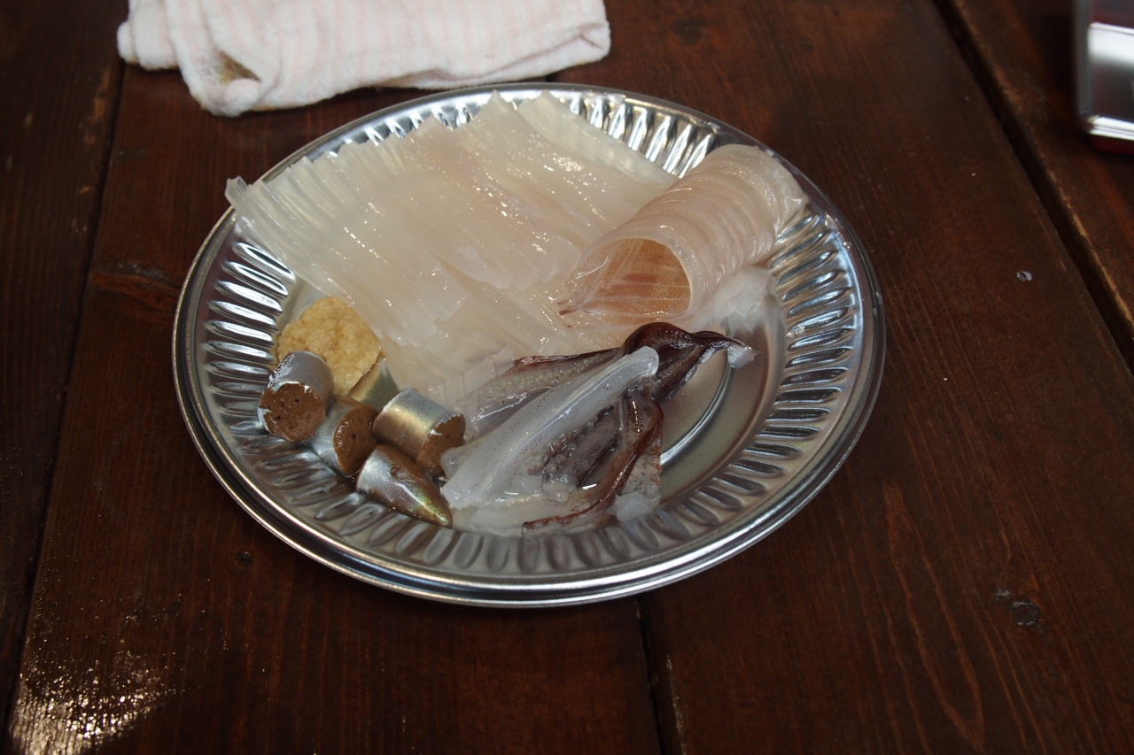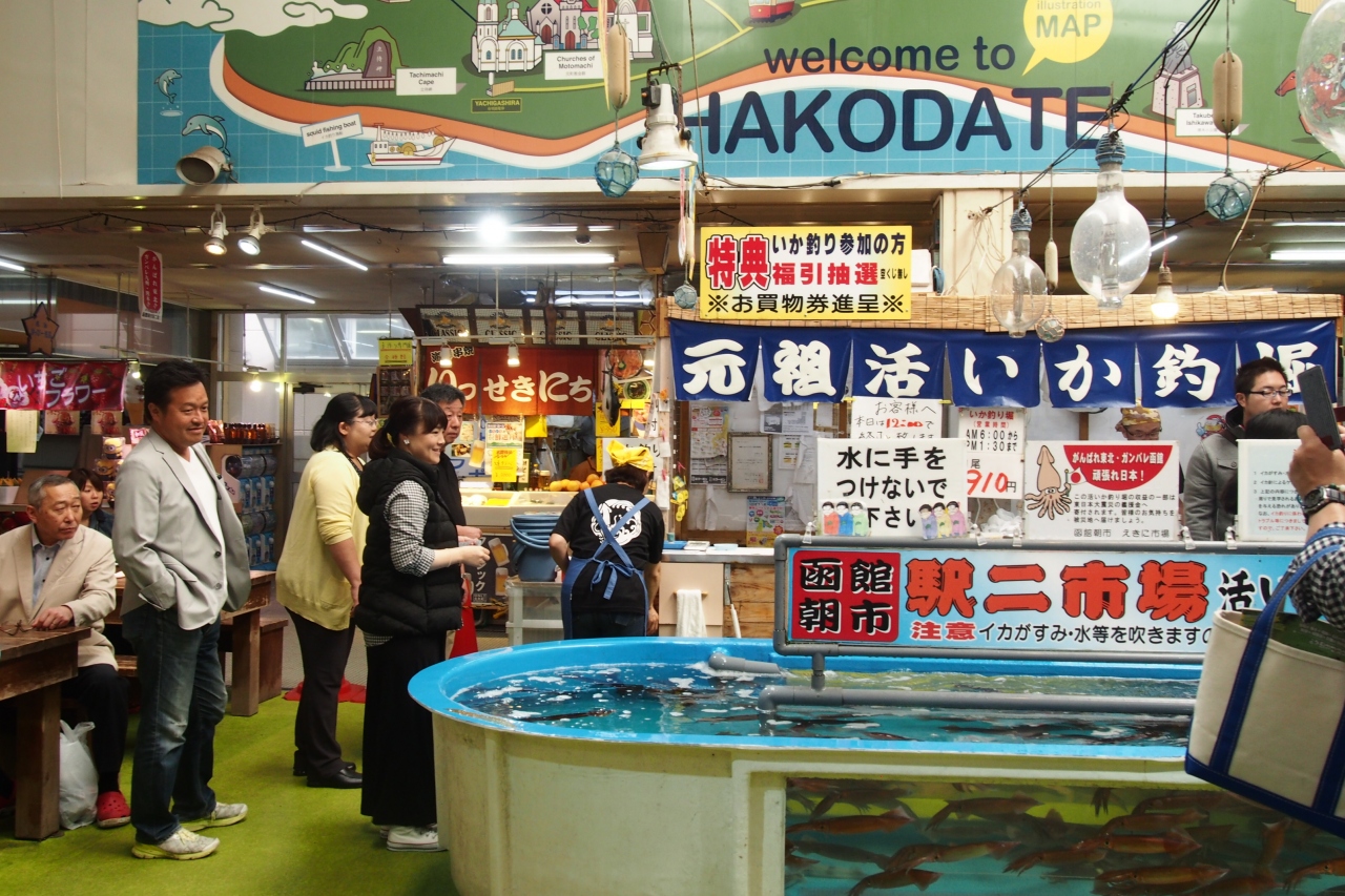 函館駅二市場名物「活イカの釣り堀」みんな順番を待っています。竿を貰って大きなイカを探して向かいますが簡単そうでなかなか…水を吐きかけられながらもゲット!釣りたてを早速お刺身にさばいてもらいみんなで味見。昨夜頂いた居酒屋の活き造りも美味しかったけど、今日は更に美味しく感じました。